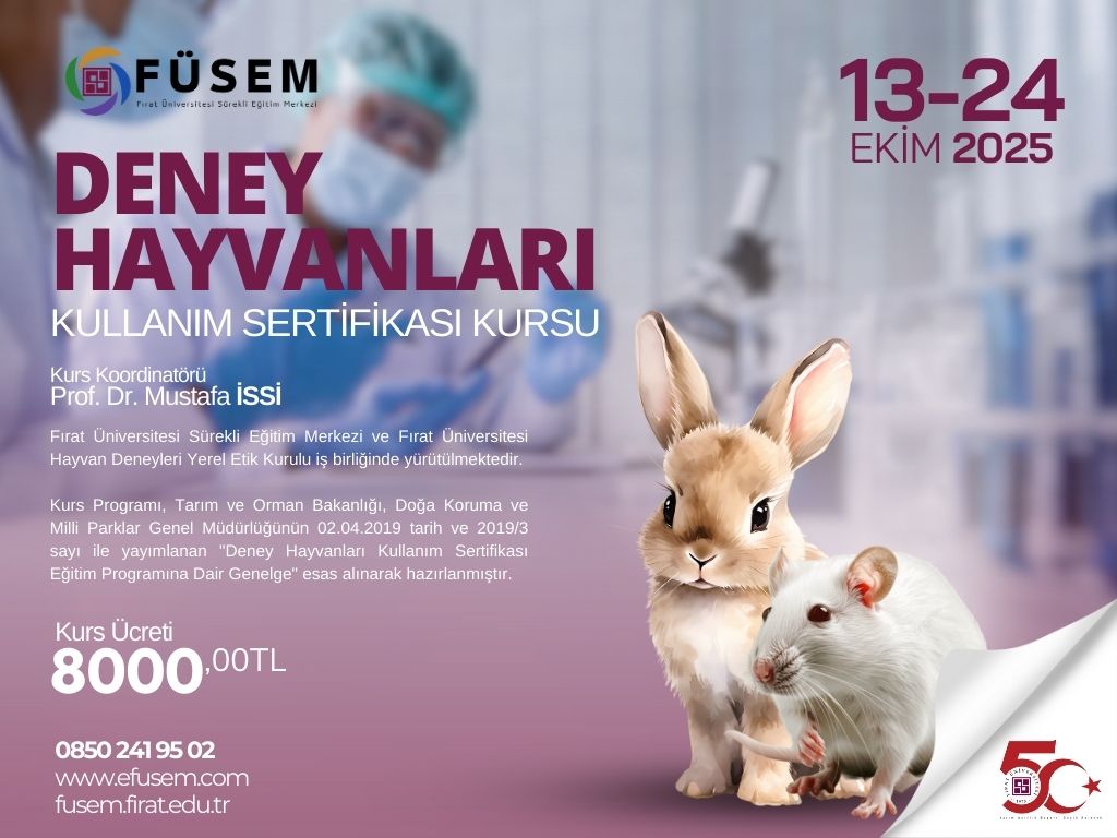 Fırat Üniversitesi Sürekli Eğitim Merkezi (FÜSEM) ve Fırat Üniversitesi Hayvan Deneyleri Yerel Etik Kurulu iş birliğinde düzenlenecek olan Deney Hayvanları Kullanım Sertifikası Kursu, Tarım ve Orman Bakanlığı Doğa Koruma ve Milli Parklar Genel Müdürlüğü’nün 02.04.2019 tarihli ve 2019/3 sayılı “Deney Hayvanları Kullanım Sertifikası Eğitim Programına Dair Genelge” esas alınarak hazırlanmıştır.